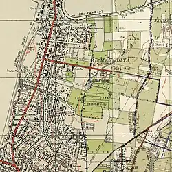 The village shown within the Jaffa municipality (thick red line) on a 1930 Survey of Palestine map; click image to view full map