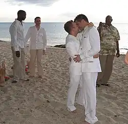 Major Alan G. Rogers (top left) holding hands with his date during same-sex wedding ceremony on June 28, 2006