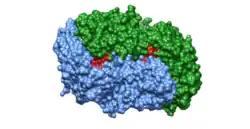 Figure 2. Surface diagram of alanine racemase. The two monomers are colored in blue and green. The two reaction sites are colored in red.