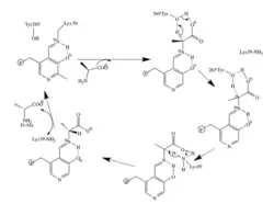 This mechanism is supported by mutations of Arg219. Mutations changing Arg219 to a carboxylate result in a quinonoid intermediate being detected whereas none was detected with arginine.[9] The arginine intermediate has much more free energy, is more unstable, than the acidic residue mutants.[8] The destabilization of the intermediate promotes specificity of the reaction.[9][10]