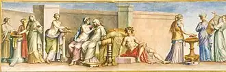 The classic interpretation of the work, devised by the classical scholar Winckelmann, is that the scene depicts the wedding of Peleus and Thetis, parents of the hero Achilles. A second hypothesis, formulated in the 18th century by Luigi Dutens, is that the scene is the marriage of Alexander the Great and Roxana. These interpretations were pre-eminent until 1994, when Frank Müller proposed a scene from the play Hippolytus by Euripides as a guide for the correct reading of the fresco. Others have proposed some passages of Alcestis as defining the scene.