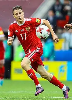 On 11 May 2018, he was included in Russia's extended 2018 FIFA World Cup squad.[21] On 3 June 2018, he was included in the finalized World Cup squad.[22] On 14 June 2018, he played a crucial role in Russia's 5–0 victory over Saudi Arabia making two assists and scoring the final goal, a free-kick in the opening match of the 2018 World Cup.[23]