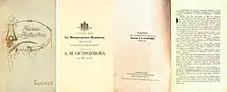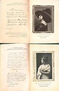 In 1912, the Moscow Institute of Medical Cosmetics A. M. Ostroumov published an album of promotional photos with autographed notes entitled "Our Artists" ("Nashi artistki").[10] The album was printed in 1912 at the A. I. Mamontov Printing House in Moscow and the artists photographs were taken by Karl A. Fischer, the photographer of the Russian Imperial House.[11]