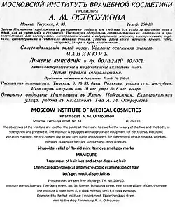 8. ^ Rascanu, Dan (March 31, 2022). "English: Advertising Poster "Institute of Medical Cosmetics A. M. Ostroumov", Moskow, Russia, from about 1912, with translation from 2022. Photo collage based on an original photo from the family Rascanu - Kosmachev - Ostroumov archive" – via Wikimedia Commons.