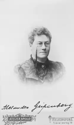 Gripenberg was born in 1857, and her family were Swedish-speaking nobles.[2] She was instrumental in the establishment of the first official women's rights organization in Finland, the Suomen Naisyhdistys (Finnish Women's Association), in Helsinki in 1884 and became one of its active members.[2] She served as the president of the association for two terms, 1889–1904 and 1909–1913.[3] Between 1887 and 1888, she traveled in England and the United States, to study lessons from the women's movements of those countries. The tour inspired her book A Half Year in the New World published in 1889. The same year she also founded one of the earliest Finnish women's magazines, Koti ja Yhteiskunta, which was published until December 1911.[4] Gripenberg was also the editor-in-chief of the magazine which acted as the organ of the Suomen Naisyhdistys.[4] She served as the treasurer of the International Council of Women from 1893 to 1899.[2]