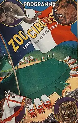 Alfred and his brother Jules Court founded the Zoo Circus, France's first modern circus-menagerie.[1] They purchased the annex of the Remount Center in Bouilhaguet, near Miramont-de-Guyenne, before debuting the Zoo Circus in Limoges.[5] The Zoo Circus thrived after the war but went into decline by 1928 and closed in 1932 as a result of bankruptcy.[1]