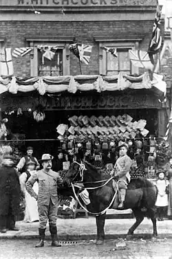 William Hitchcock, probably with his first son, William, outside the family shop in London, c. 1900; the sign above the store says "W. Hitchcock's". The Hitchcocks used the pony to deliver groceries.