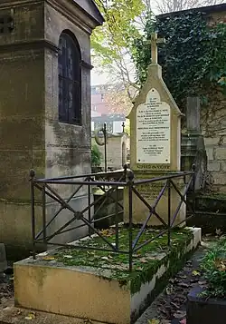 Vigny developed what is believed to have been stomach cancer during his early sixties. He endured its torments with exemplary stoicism for several years: 'When we see what we were on Earth and what we leave behind/Only silence is great; everything else is weakness.' (A voir ce que l'on fut sur terre et ce qu'on laisse/Seul le silence est grand ; tout le reste est faiblesse.)[10] Vigny died in Paris on 17 September 1863, a few months after the death of his wife. He was buried beside her in the Cimetière de Montmartre in Paris. Several of his works were published posthumously. In 1876, the composer Ruggero Leoncavallo wrote an opera CHATTERTON based upon Vigny's play and novel.