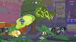 Alien Hominid Invasion is a side-scrolling roguelike shooter with exp leveling and loot mechanics.[4] Players must navigate an overworld map completing objectives and destroying city blocks until they progress to a headquarters where they can defeat a boss to extract earned loot. Different paths can be chosen to avoid hazards and find hideouts that contain items and loot storage.[5]