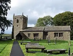 The church is built of stone, with a stone slate roof. It consists of a nave and a chancel under a continuous roof, a north aisle, a south porch and a west tower, and is in Perpendicular style. The tower has angle buttresses, arched bell openings, gargoyles, and an embattled parapet with corner pinnacles. The south doorway has one order of waterleaf capitals and the shafts lost. In the south wall of the chancel is a round-headed priest's door, and the east window has three cusped traceried lights. Inside are two alabaster sculptures of the Virgin Mary, found during the Victorian restoration; various monuments to the Tempest family; and a 12th-century font.[1][2][6]