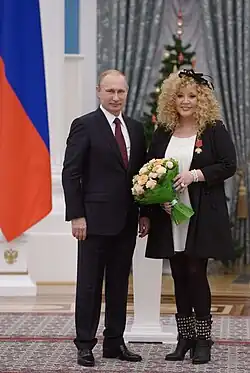 She became a People's Artist of the USSR in 1991, a Laureate of the State Prize of the Russian Federation in 1995. In addition to state awards, Pugacheva was awarded regional and international music prizes. She has received awards in several countries around the world, including the United States, Germany, Finland, Poland, Bulgaria, Ukraine, Belarus, Azerbaijan, Armenia and the Ampex Golden Reel Award, among others. Pugacheva was recognized as the best singer of the 20th century in Eastern Europe by the ZD Awards, named a living legend and the best performer of the 1990s decade by the Ovation Award.[31] In 2017, she was included in the list of "100 most influential Russians of the century" according to Forbes, along with Mikhail Gorbachev, Yuri Gagarin and Pavel Durov.[32] In 2022, she was among three Russian women included in the BBC's 100 Women list.[33][34] Pugacheva was inducted into the Top Hit Music Awards Hall of Fame.[35] For several decades, Pugacheva had the largest fee among performers in Eastern Europe.[36] Due to her many years of popularity in Eastern Europe and Central Asia, Pugacheva was compared by the media to Madonna, and she received the nickname Russian Madonna.[37][38][39]
