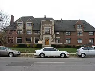 Alpha Tau Omega Fraternity House was in Collegiate Gothic style designed by architect Robert Frost Daggett, an ATO member from the University of Pennsylvania chapter and member of the Indianapolis architectural firm R. P. Daggett & Co.[3][2]: 10 Daggett was the first person from the state of Indiana to be admitted to the Ecole des Beaux-Arts in Paris, graduating from there in 1901.[2]: 11 Alpha Tau Omega Fraternity House was built in 1920 by Allan V. Stackhouse, a Gamma Omicron chapter alumnus.[2]: 10