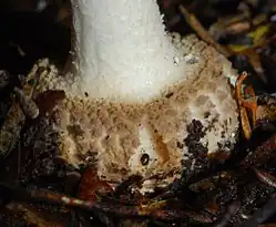 The gills are crowded closely together, free from attachment to the stem, 6–10 mm (1438 in) wide, and white. The lamellulae (short gills that do not extend fully from the cap edge to the stem) have truncated ends. The stem is 37–90 mm (1+123+12 in) tall, 6–26 mm (14–1 in) in diameter, and narrowest at center. It is hollow, and has an abruptly bulbous base that is between 14 and 38 mm (12 and 1+12 in) in diameter. The surface of the stem above the level of the ring is white and covered in woolly tufts of mycelia; below the ring it is white with buff to greyish transverse, grooved bands. The base may or may not have a rim of volval remnants that are powdery, and a greyish-buff to greyish-sepia colour. The ring is membranous, white to buff, first hanging freely then later adhering to the stem. The flesh of the cap is white, occasionally pale isabelline under the center of the cap; the flesh of the stem is white.[1]
