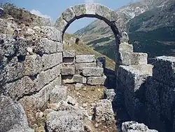 The city was built around 450 BC on the site of a proto-urban settlement. Already from the beginning it had a fortified acropolis that was surrounded by a 2.1 km long wall, with also a lower town. The original walls made of irregularly slammed limestone were renewed in the 4th century with isodomic ashlar layers.[24] By the 4th century or later, the indigenous site became a town very much organised on a Greek model, acquiring the trappings of a Hellenistic city.[25][4] It has been suggested that in terms of fortifications, masonry and general architecture, language and religion Amantia shares the same features as the rest of the settlements of the Greek world of that time.[26] But it has been also assumed that like other Illyrian cities Amantia, was not a polis of the Greek type.[24] Amantia was among the main cities and tribal centres of Epirus during the Hellenistic period.[27]