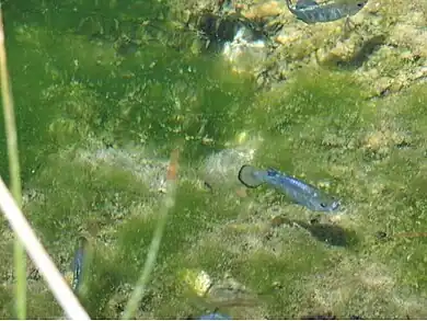 These diminutive fish subsist on cyanobacteria and algae which are abundant in their habitat. However, they have been known to feed on smaller invertebrates, including mosquito larvae and copepods.[2] This feeding strategy allows them to thrive in environments where other food sources may be scarce. In a study conducted over several seasons, detritus made up the majority of this species' stomach (65% in October, 90% in November) while algae, vascular plants, and animals were minimal.[3] The pupfish's selection of food seems to be dictated by biological and physiochemical restrictions placed on the food supply based on their extreme environment.[3] Smaller invertebrates as food seemed to have greater importance in other seasons.[3]