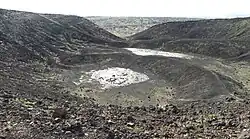 Interior of Amboy Crater showing a lava lake and the distant breach in the cinder cone rim.