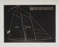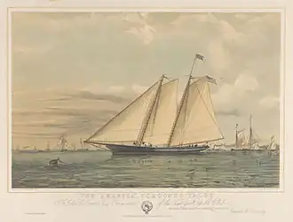 America was designed by James Rich Steers and George Steers (1820–1856) (See George Steers and Co). Traditional "cod-head-and-mackerel-tail" design gave boats a blunt bow and a sharp stern with the widest point (the beam) placed one-third of the length aft of the bow. George Steers' pilot boat designs, however, had a concave clipper-bow with the beam of the vessel at midships. She was designed along the lines of the pilot boat Mary Taylor.[7] As a result, his schooner-rigged pilot boats were among the fastest and most seaworthy of their day. They had to be seaworthy, for they met inbound and outbound vessels in any kind of weather. These vessels also had to be fast, for harbor pilots competed with each other for business. In addition to pilot boats, Steers designed and built 17 yachts, some which were favorites with the New York Yacht Club.[8]