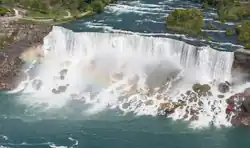 The American Falls is the second largest of the three waterfalls that together are known as Niagara Falls on the Niagara River along the Canada–United States border. Unlike the much larger Horseshoe Falls, of which approximately 90% is in Ontario, Canada, and 10% in the U.S. state of New York,[2] the American Falls is entirely within the United States.