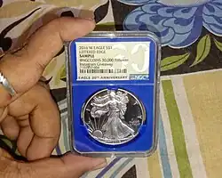 - ^ "United States Mint Announces Plans to Issue American Eagle 25th Anniversary Silver Coin Set" (Press release). United States Mint. August 19, 2011. Retrieved October 13, 2011.