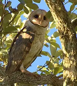 The American barn owl is a medium-sized, pale-coloured owl with long wings and a short, squarish tail.[4] However, the largest-bodied race of barn owl, T. f. furcata from Cuba and Jamaica, is also an island race, albeit being found on more sizeable islands with larger prey and few larger owls competing for dietary resources.[5] The shape of the tail is a means of distinguishing the barn owl from typical owls when seen in the air. Other distinguishing features are the undulating flight pattern and the dangling, feathered legs. The pale face with its heart shape and black eyes give the flying bird a distinctive appearance, like a flat mask with oversized, oblique black eye-slits, the ridge of feathers above the beak somewhat resembling a nose.[6]