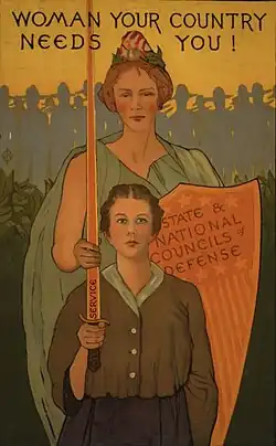 Social status often dictated the way in which a woman was involved in the war effort. Working-class women were generally the ones enlisting in the armed forces or taking over jobs left behind, while middle and upper-class women generally participated in voluntary organizations.[22] These were the women with more free time, whose living standards did not necessitate that they earn a salary. One prominent issue at the outset of the war was how to organize and coordinate female support and service, which led for female leaders to push for the creation of the Woman's Committee of the Council of National Defense (WCND), established by the Wilson administration to serve as an advisory committee.[23] The Committee appropriated projects to voluntary organizations such as the Red Cross, Women's Temperance Union and others, in order to drum up support for the war and mobilize the female half of the population amidst rising manpower concerns.
