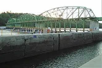 Lock E11 includes a truss structure which spans the river and which has multiple steel gates which can be opened and closed by the use of electric winches in order to dam the river or let it flow freely. Seven other locks have these trusses, but only two of them carry roadways; this is not one of them.