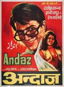 Andaz (transl. Style) is a 1971 Indian Bollywood romantic drama film, directed by Ramesh Sippy in his directorial debut, and written by Salim–Javed, Gulzar and Sachin Bhowmick.[1] It stars Shammi Kapoor and Hema Malini in lead roles with Rajesh Khanna and Simi Garewal making special appearances.
