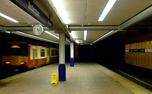 Anderston railway station serves Glasgow's financial district of Anderston and, across the M8 motorway, the housing schemes of both Anderston West and the Blythswood Court estate of the Anderston Centre. It is also close to both the Hilton and Marriott hotels. It is a staffed station with an island platform and most of it is underground.