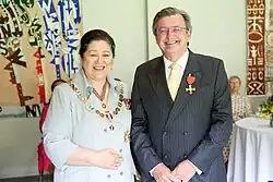 Barnes (right), after his investiture as an Officer of the New Zealand Order of Merit by the governor-general, Dame Cindy Kiro, at Government House, Auckland, on 26 September 2024