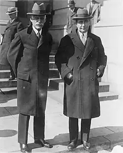 Like his father, Mellon consistently supported the Republican Party, and he frequently donated to state and local party leaders. Through state party boss Matthew Quay, Mellon influenced legislators to place high tariffs on aluminum products in the McKinley Tariff of 1890.[42] During the early 20th century, Mellon was dismayed by the rise of progressivism and the antitrust actions pursued by the presidential administrations of Theodore Roosevelt, William Howard Taft, and Woodrow Wilson. He especially opposed the Taft administration's investigations into Alcoa, which in 1912 signed a consent decree rather than going to trial.[43] In the aftermath of World War I, he provided financial support to Henry Cabot Lodge and other Republicans in their successful campaign to prevent ratification of the Treaty of Versailles. Mellon attended the 1920 Republican National Convention as a nominal supporter of Pennsylvania Governor William Cameron Sproul (Mellon hoped Senator Philander Knox would win the nomination), but the convention chose Senator Warren G. Harding of Ohio as the party's presidential nominee. Mellon strongly approved of the party's conservative platform, and he served as a key fundraiser for Harding during the presidential campaign.[44]