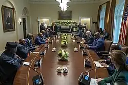 On 6 March, after the Malagasy authorities attempted to arrest him, Andry Rajoelina took refuge in the French embassy.[23][24] On 10 March, the Army issued a 72-hour ultimatum, ordering the political leaders to find a solution to the crisis, or face military intervention.[25][26] On 15 March, Ravalomanana went on air to propose a referendum to solve the crisis,[27] an offer refused by Rajoelina who instead called for the President's arrest.[28] The following day, Ravalomanana dissolved the government, resigned, and transferred the Presidential seal to a senior committee of the Army.[29] On 18 March, the Army transferred power directly to Rajoelina, making him president of the High Transitional Authority (HAT). Madagascar's constitutional court deemed the double-transfer of power (Ravalomanana-Army-Rajoelina) to be legal.[30]