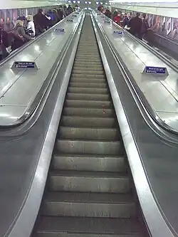 Angel is one of fourteen stations to have only escalator access to the platforms.[17] With a vertical rise of 90 ft (27 m) and a length of 200 ft (61 m), the escalators at Angel station are the longest on the Underground,[12][13] and in the United Kingdom.[18]