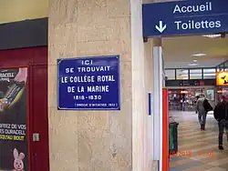 The station building is part of the former Collège Royal de la Marine, as testified by an enamel plaque in the booking hall.
