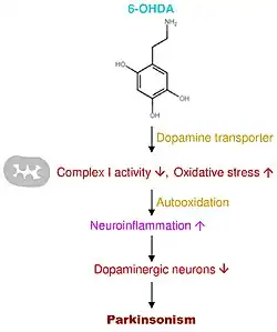 The mechanism of action of 6-OHDA occurs through the aggregation of toxins and the conversion into catecholaminergic neurons. Since the structures of both dopamine and 6-OHDA are similar, the dopamine transporter takes up the 6-OHDA and induces toxicity.[7][6] This toxicity emerges from the production of free radicals from the additional hydroxyl group in the neurotoxin's structure. There is also oxidative stress occurring mediated through the inhibition of the cell's mitochondrial complex I, producing ROS (reactive oxygen species), which causes a decrease or loss in respiratory activity. In addition, there is also the proposed mechanism of oxidative stress inducing neuroinflammation (Figure 3).[4][6]