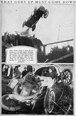 King's accomplishment made her a national celebrity and Paramount Studios quickly began production of a movie version of her trip titled "The Race", directed by George Melford.[1] King made numerous public appearances on behalf of the studio, the Kissel, and Firestone, doing daredevil auto stunts and being photographed with the likes of Barney Oldfield driving his famous Golden Submarine.