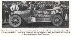 In 1915, King decided to put her automobile driving experience to the test and set out to become the first female to drive alone across the continental United States. With the backing of studio boss Jesse L. Lasky, and his newly formed Paramount Pictures, they got the Kissel Motor Car Company to provide her with a vehicle equipped with Firestone tires. Dubbed "The Paramount Girl," amidst much publicity on August 25, she set out in her Kissel Kar from Paramount's studio in Hollywood. The Los Angeles Times wrote, "Her only companions will be a rifle and a six shooter."[1] Lasky arranged for Geraldine Farrar to bid farewell to King at the start of the trip.[1] First heading north to San Francisco, King spent several days doing publicity appearances at the Panama-Pacific World's Fair. With even more fanfare, and declaring that "if men can do it, so can a woman," she headed east. After many promotional stops at Paramount theaters along the way, and coverage by major newspapers coast to coast, on 19 October, after forty-nine days on the road, King received a hero's welcome in New York City, with Motor Age remarking she had arrived with "Los Angeles air in the front tires of her car".[1]