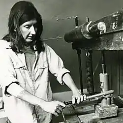 ![]() Wetzel operating the hydraulic press at the Women's Studio Workshop (WSW) in 1979 | |