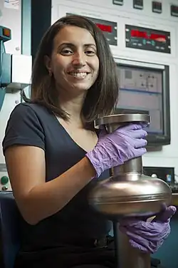 She is known for her pioneering work in superconducting radio frequency cavities for next generation particle accelerators.[1][12] As a postdoc, Grassellino experimented with introducing a small amount of nitrogen into the inner surface of the cavities, which are made of niobium and surface treated using electropolishing.[13][14] She and her group noticed that residual nitrogen remaining in the cavity systematically improved the RF superconductivity response.[4][15] By baking the niobium SRF cavities at high temperatures in the presence of nitrogen, the Q factors more than tripled; dramatically reducing the cryogenic costs of the large accelerator facilities.[13][16] She made the discovery of nitrogen doping by accident, hoping to create niobium nitride but instead found with her FNAL group – via material and surface science studies – that the real effect was due to nitrogen as interstitial.[16] Superconducting radio frequency cavities generate high energy with high current and expel magnetic flux, which can result in power dissipation.[17] The technology has been adopted as the standard for SRF cavities and used in laboratories all over the world, as well as private firms.[4][18] The LCLS-II HE upgrades at SLAC are the first world class accelerator facilities to be built entirely with the nitrogen doping technology. In 2015, she was awarded a $2.5 million Early Career Award from the United States Department of Energy, which allowed her to employ postdoctoral fellows.[4]