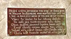 A tradition recorded in 1693 is that Hathaway "greatly desired" to be buried with her husband.[12] In fact she was interred in a separate grave next to him in the Church of the Holy Trinity, Stratford-upon-Avon. The inscription states, "Here lyeth the body of Anne wife of William Shakespeare who departed this life the 6th day of August 1623 being of the age of 67 years." A Latin inscription followed which translates as "Breasts, O mother, milk and life thou didst give. Woe is me—for how great a boon shall I give stones? How much rather would I pray that the good angel should move the stone so that, like Christ's body, thine image might come forth! But my prayers are unavailing. Come quickly, Christ, that my mother, though shut within this tomb may rise again and reach the stars."[16] The inscription is believed to have been written by John Hall on behalf of his wife, Anne's daughter, Susanna.[4]