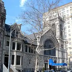 The Annunciation Greek Orthodox Church is a Greek Orthodox church at West End Avenue and West 91st Street on the Upper West Side of Manhattan in New York City. The church was built by Heins & LaFarge in 1893–94 as the Fourth Presbyterian Church. The church was sold to a Greek parish in 1952.[1] The rusticated masonry façade with a sparing use of Venetian Gothic and Richardsonian Romanesque details and the square corner bell tower with a crenellated parapet embellished with gargoyle gutter-spouts reveal Richardson's training. Fine stained glass may be from Tiffany studios, or may be by John LaFarge, the architect's father, which would make them even rarer.[1][2][3]