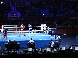 Round of 16 bout against Evhen Khytrov (red) at the 2012 Summer Olympics in London