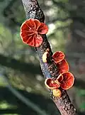Fruit bodies are rust coloured to dark red, and are fan shaped. They grow in groups on dead twigs.[6] Caps are on average 3–20 mm (0.1–0.8 in) diameter.[7][2] Horizontal caps are attached laterally to substrate and are sessile with a very small thickened stem like point. Shapes range from reniform to almost circular, convex,[6] and almost symmetrical, deeply grooved radiating from point of attachment, following gill outline [7] Pileus is coloured creamy pale pink to reddish brown, and smooth, when young covered in scaly whitish dust.[4] Gills are orange to brown, widely spaced,[3] and radiating from the pale, thickened point of attachment to the substrate.[6] Spores are translucent, 7.5–12.5 μm long, and 5–8 μm wide,[3][7] with a white spore print. Context is 1–2 mm (0.04–0.08 in) thick, and pale with a thickened wall.[4]