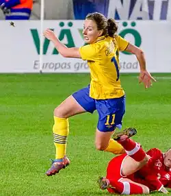 As a Swedish under-19 international, Göransson played in the 2009 U-19 European Championship in Belarus, where Sweden lost 2–0 in the final to England.[19] At the 2010 U-20 World Cup in Germany, Göransson was surprised to be utilised as a makeshift striker. She scored four goals in four games as Sweden were beaten 2–0 by Colombia in the quarter-final.[20]