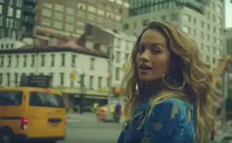 In the next scene, Ora holds blue balloons while walking through traffic and on sidewalks, sporting a matching blue velveteen coatdress and knee-high boots from Off White's Fall 2017 collection.[47][50] The singer is also shown on a moving carriage in an Attico multi-patterned halter gown, Colin LoCascio red faux-fur coat and Saint Laurent Niki Swarovski crystal-embellished leather knee-high boots. In other scenes, she has hip hop-style looks including a Mulberry jumpsuit, a black Paco Rabanne top and bottom, and a Madeleine Thompson rainbow cashmere tracksuit with a pink bucket hat by Kangol and Marc Jacobs. In a scene near the end of the video, Ora runs in a street in a vintage Vivienne Westwood wedding dress, Gigi Burris veil and Mulberry boots.[47]