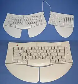 It was hinged at the top, allowing the user to adjust the angle between the right and left sides of the keyboard. The split came between the key pairs: 5/6, T/Y, G/H, and B/N. The space bar floated midway between the two parts.