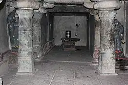 The overall decoration is simple with dancing celestial maiden (apsaras) within volutes of scrolls (lata-patra, lit, "creeper leaf") which extend over the door jamb and linel. On either side of the entrance doorway are two tall rectangular vertical slabs reaching up to the lintel, divided into four panels with relief friezes depicting male drummers (called dola-nritya). The top panel has rustic male dancers who appear to dance to a musicians' ensemble who play the drum, violin, rudra veena, flute and the kanjira. According to the historian Sarma, in no contemporary temple are such native (desi) forms of dance depicted.[7] The most interesting bas-relief sculptures in the temple, according to Sarma, are the ones on the rounded pillars in the nandimantapa and the closed mahamantapa. These relief vividly depict the victory of Butaga II over the Chola prince Rajaditya, in addition to themes from the Hindu epics, mythical figures and demi-gods.[3][5][8] The high point of the relief work, in the closed mahamantapa is the ashtadikpalaka grid ("guardians of eight directions") in the ceiling with a central dancing Shiva (called natya shiva). There are several independent sculptures in the closed hall, including Mahishasuramardini (version of the goddess Durga slaying an asura), Yago Dakshinamurthy (god Shiva as "the teacher"), Saptamatrika (seven celestial mothers) and other sculptures that adhere to the 8th-9th century Ganga-Chalukya sculptural idiom.[9]