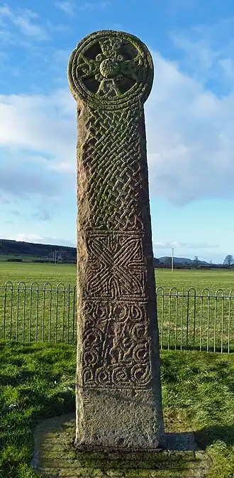 Artefacts from the medieval period also show evidence of Celtic Christianity. Augustine become the bishop of Canterbury in 590 AD, however, St Illtud was already spreading Christianity in Celtic Wales, perhaps very soon after Roman departure in 383 AD.[30] Celtic Christian stone crosses are now held within the 13th century Galilee chapel at St Illtud's church in Llanilltud Fawr (Llantwit Major) and are thought to date from the 8th to 10th centuries.[31] Perhaps the most famous Celtic cross in Wales and the tallest wheel cross in Britain is the Maen Achwyfan (Stone of (Saint) Cwyfan) which most likely dates from the 10th century. This monument contains Celtic- and Norse-influenced carvings of an armed warrior and is considered nationally important in the story of Christianity in Wales.[32][33][34]