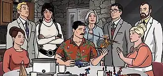 From left to right: principal cast members H. Jon Benjamin (Sterling Archer), Aisha Tyler (Lana Kane), Jessica Walter (Malory Archer), Judy Greer (Cheryl Tunt), Chris Parnell (Cyril Figgis), Amber Nash (Pam Poovey) and Lucky Yates (Dr. Krieger)