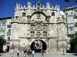 Arco de Santa María in Burgos, Spain, is one of the twelve gates the city had during the Middle Ages. It was rebuilt by Charles V, Holy Roman Emperor during the 16th century after the local rulers of the city supported him during the Revolt of the Comuneros. On the facade of the gatehouse appear statues of real or legendary people of importance to the city of Burgos and to Castile, namely Count Fernán González (c. 910-970) and El Cid flanking Charles V (upper level), and the mythical 9th-century Castilian judges or "Jueces de Castilla", Laín Calvo and Nuño Rasura, by tradition forefathers of El Cid and Fernán González, respectively, flanking Count Diego Rodríguez Porcelos, the founder of the city in 884.[1]