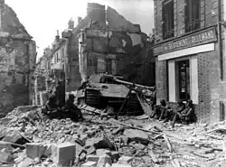 During World War II, the city was almost totally destroyed. On 5 June 1944, on the eve of the Allied D-Day landing on the beaches of Normandy, the city suffered an important air raid in which the train station was destroyed.[20] The city suffered further damage when it was bombed on 6 and 7 June by B-17 and B-24 bombers of the U.S. Eighth Air Force.[21] The greatest part of the city was, however, left in ruins two and a half months later, at the end of August, during the battle of the Argentan-Falaise Pocket. The U.S. Third Army, under the command of general George S. Patton liberated Argentan after eight days of violent combat against the German 9th Panzer Division and the 2nd SS Panzer Division Das Reich. The U.S. 80th Infantry Division liberated the city in the morning of 20 August.[22]